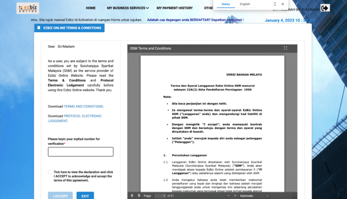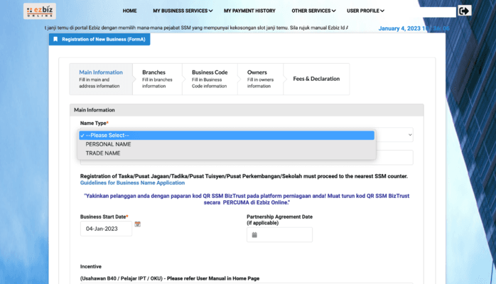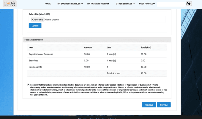 You will be charged MYR 30 for registration of the business and MYR 10 for business information. Note that surcharges are applicable for business partners. Afterwards, choose to pay via SSM physical counters or online.